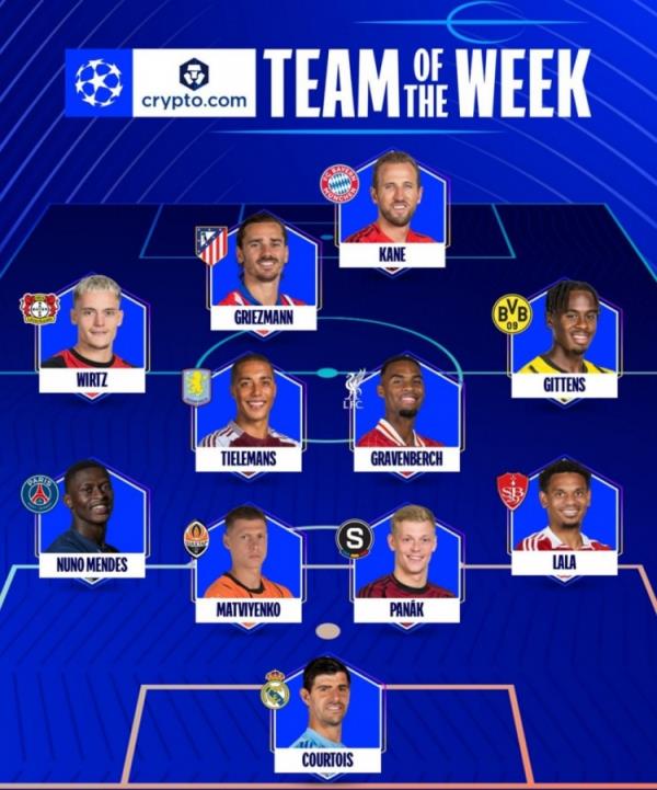 9月21日讯 新赛季首轮欧冠已经全部结束,欧足联技术观察员小组评选出了本轮的最佳阵容,凯恩、格列兹曼、维尔茨、库尔图瓦等人入选。