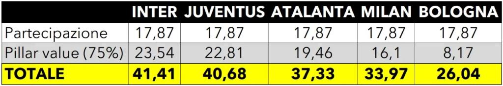 意甲球队中,国米的市场奖金最多约2350万欧,总计4141万欧。尤文将获得4068万欧,亚特兰大3733万欧,米兰3397万欧,博洛尼亚2604万欧。