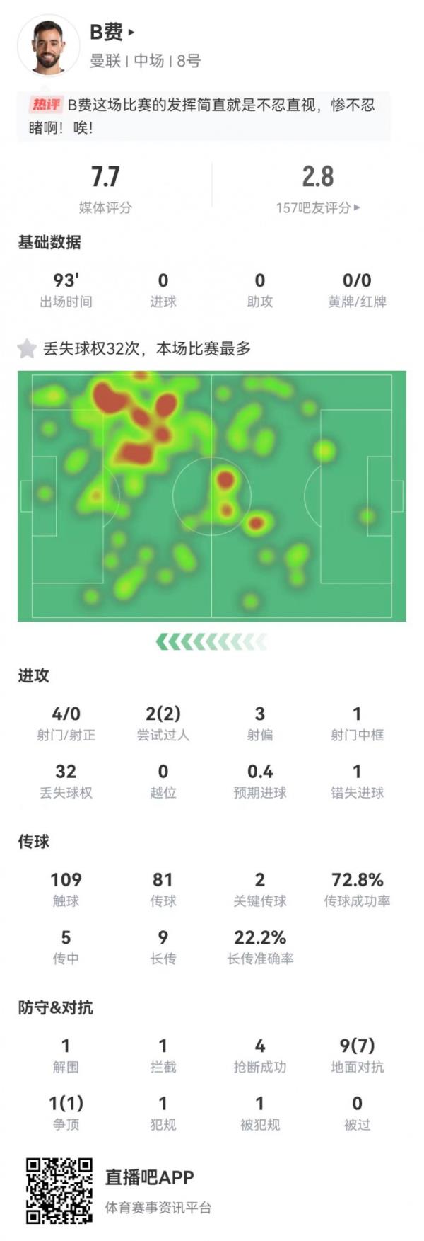 9月22日讯 曼联在本轮英超0-0战平水晶宫,B费本场数据如下: