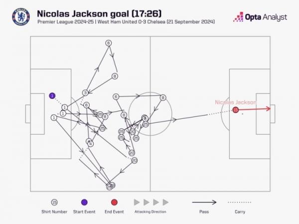 数据统计显示,杰克逊打进的第2球在进球前共计经过切尔西9名球员的26脚传递,这也是本赛季英超第2多。