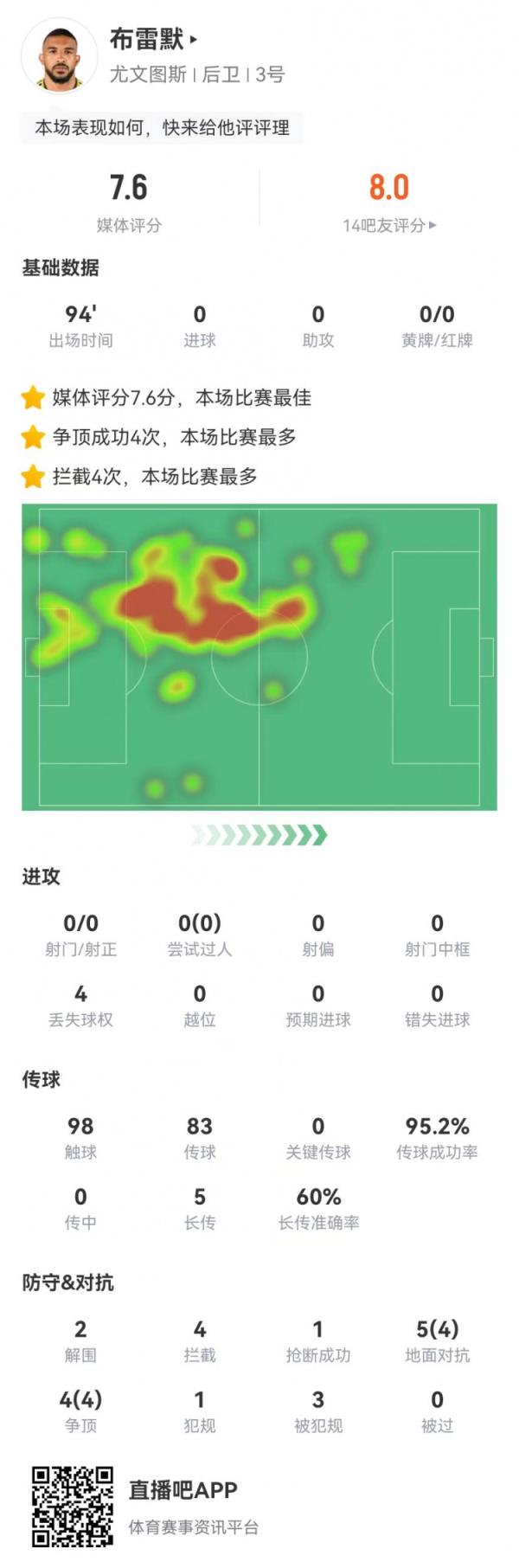 9月22日讯 尤文在本轮意甲0-0战平那不勒斯,布雷默本场数据如下: