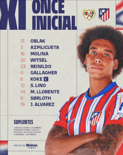 马竞首发:1-奥布拉克、3-阿斯皮利奎塔、16-莫利纳、20-维特塞尔、23-雷尼尔多、4-加拉格尔、6-科克、12-利诺、14-马科斯-略伦特、9-索尔洛特、19-阿尔瓦雷斯