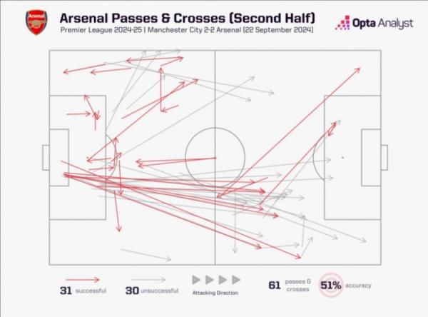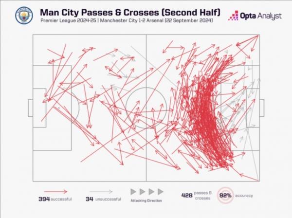 9月23日讯 曼城本轮2-2战平阿森纳,曼城下半场完全占据主动,OPTA对比了两队下半场传球数据。