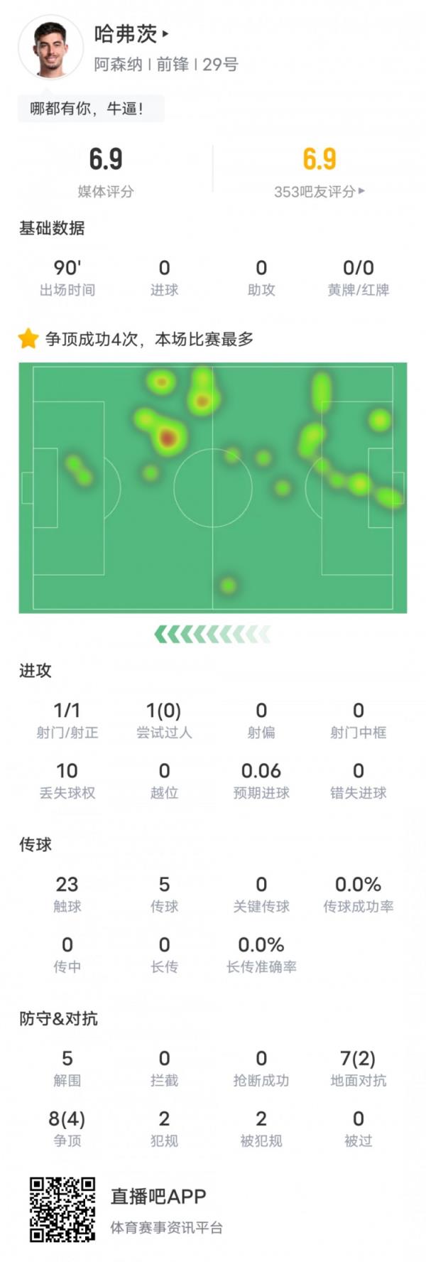 据StatMuse FC数据统计,本场比赛哈弗茨0次传球成功。最近的7个赛季,哈弗茨是英超首位踢满90分钟但0次传球成功的球员。