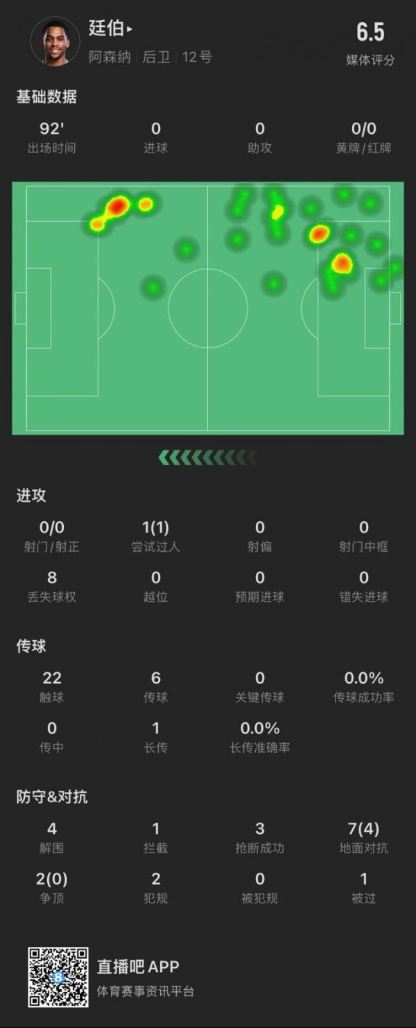 9月23日讯 在刚刚结束的英超第五轮比赛中,曼城2-2绝平阿森纳。廷伯首发出战,在补时阶段受伤被换下场,获评Sofascore6.5分的评分。