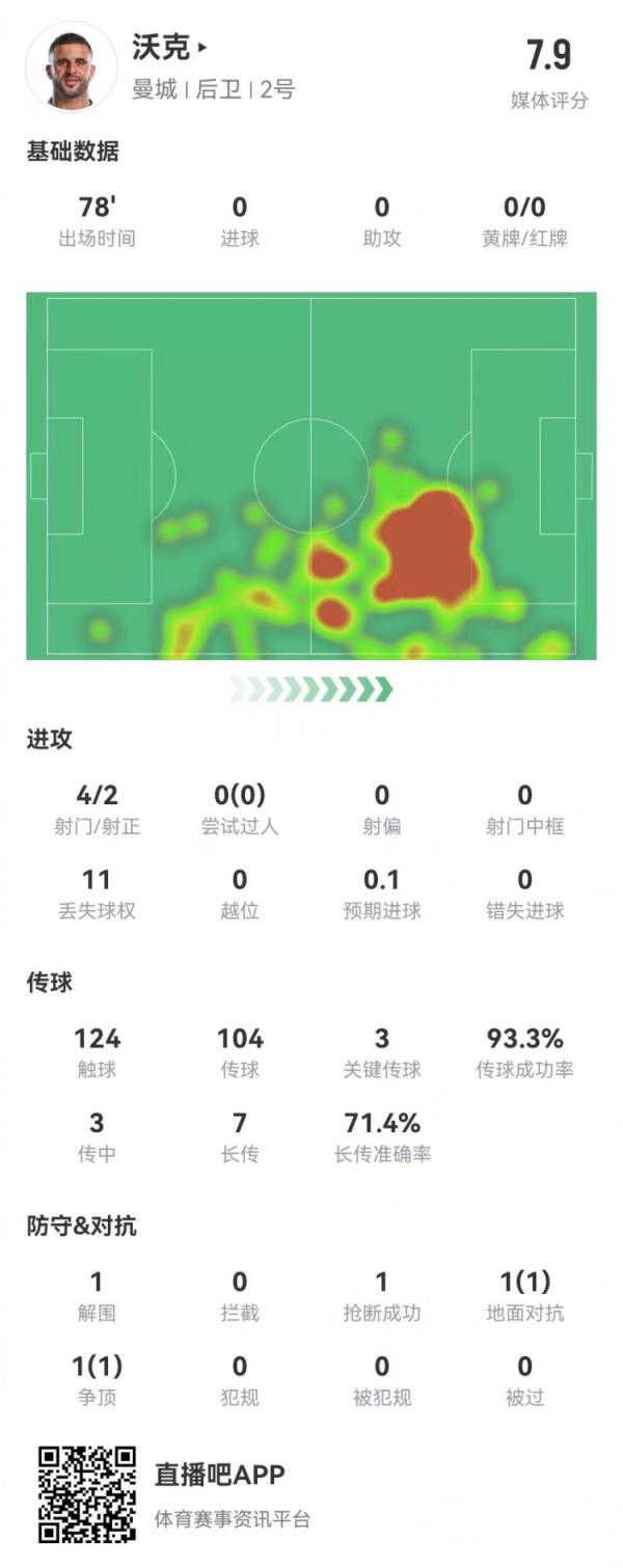 9月23日讯 曼城在本轮英超1-2落后阿森纳,沃克本场数据如下: