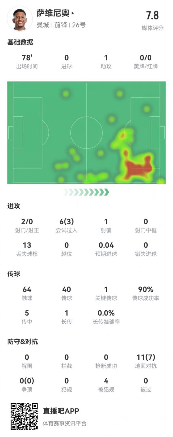 9月23日讯 曼城在本轮英超1-2落后阿森纳,萨维尼奥本场数据如下:
