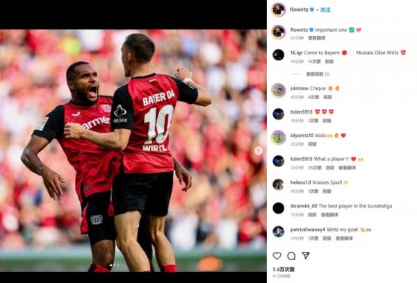 9月23日讯 勒沃库森在本轮德甲焦点战4-3绝杀沃尔夫斯堡,核心维尔茨在赛后通过社媒晒照庆祝。