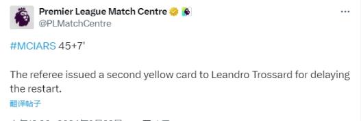 英超官方表示:“特罗萨德因拖延开球被裁判出示第二张黄牌。”
