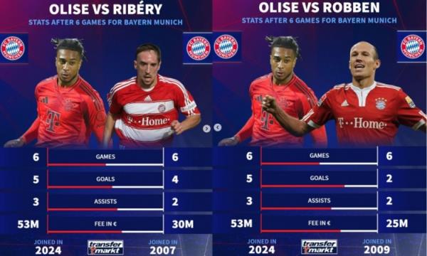 而新援奥利塞的表现也相当出色,堪称本赛季最大亮点。《转会市场》也对比了奥利塞和俱乐部传奇“罗贝里”在拜仁生涯前6场比赛的数据。