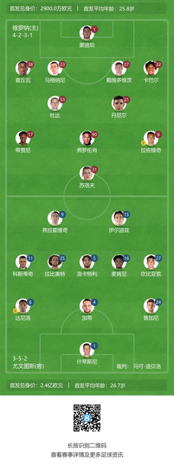 尤文首发:1-什琴斯尼、4-加蒂、24-鲁加尼、6-达尼洛、27-坎比亚索、16-麦肯尼、5-洛卡特利、25-拉比奥特、11-科斯蒂奇、15-伊尔迪兹、9-弗拉霍维奇