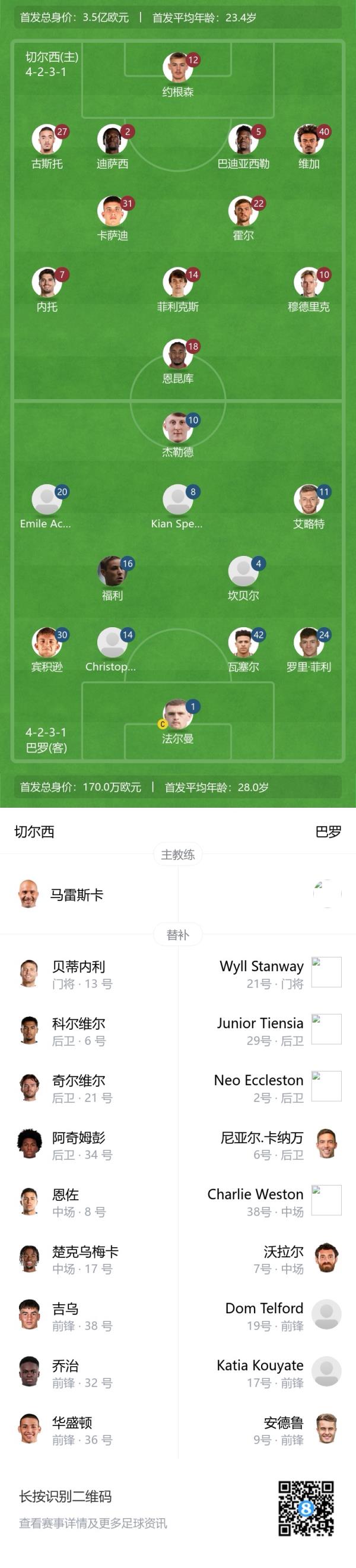 切尔西替补:13-贝蒂内利、6-科尔维尔、21-奇尔维尔、34-阿奇姆蓬、17-楚克乌梅卡、8-恩佐、32-乔治、36-戴维德-华盛顿、38-吉乌