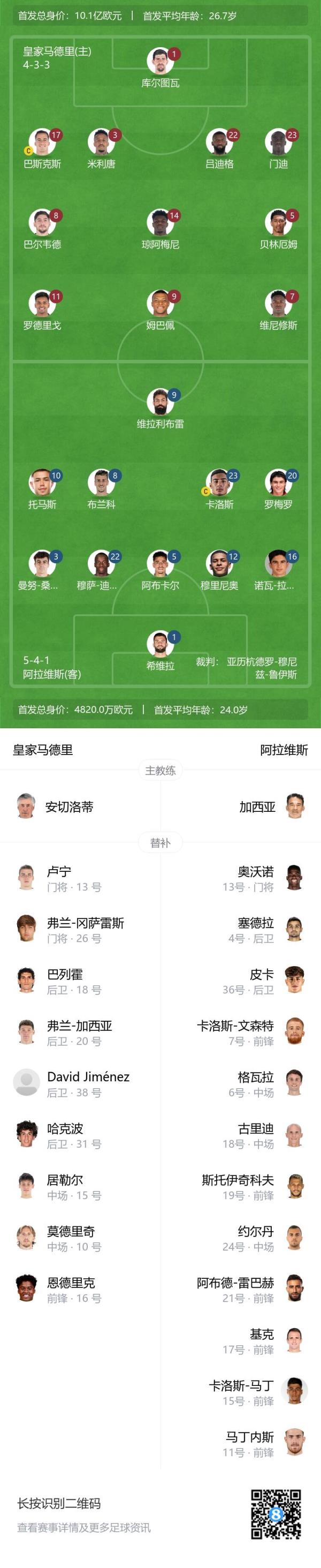 9月25日讯 西甲第7轮,皇马主场对阵阿拉维斯。赛前,官方公布了本场的首发名单。