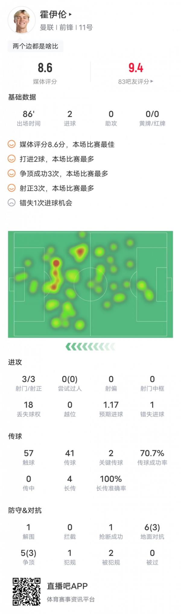 2月19日讯 在今日凌晨对阵卢顿的比赛中,曼联前锋霍伊伦首发出战,贡献2粒进球,还有2次关键传球,评分8.6全场最高。
