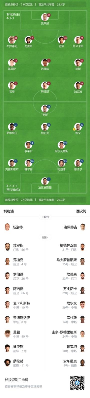 利物浦替补:56-贾洛斯、4-范迪克、7-路易斯-迪亚斯、8-索博斯洛伊、10-麦卡利斯特、11-萨拉赫、26-罗伯逊、66-阿诺德、80-莫顿