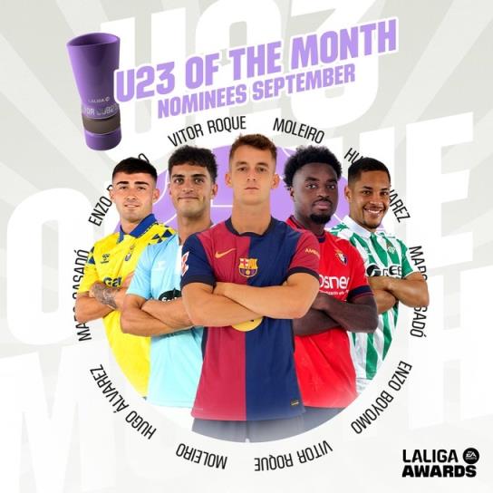 9月26日讯 西甲官方公布了9月最佳U23候选,17岁的巴萨超新星亚马尔未进入名单,不过他已经入选了本月西甲最佳球员名单。