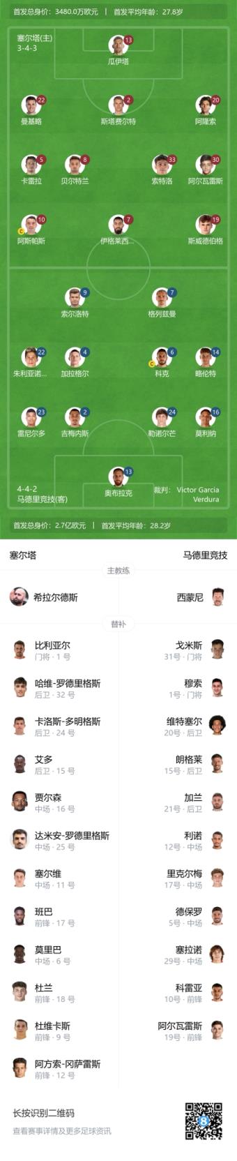 9月27日讯 西甲第7轮 塞尔塔vs马德里竞技,赛前首发名单公布。
