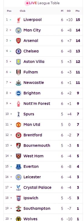 目前的英超实时积分榜,利物浦超越曼城、阿森纳登顶!