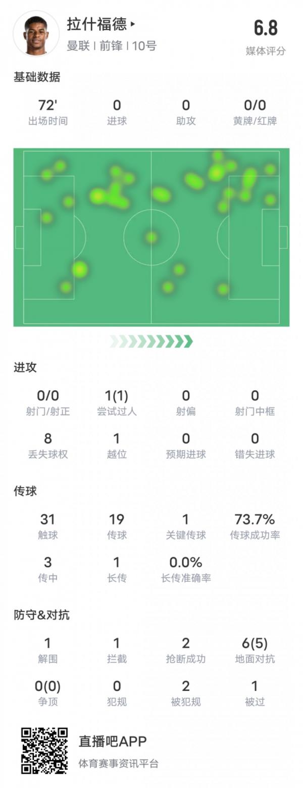 拉什福德本场比赛具体数据如下: