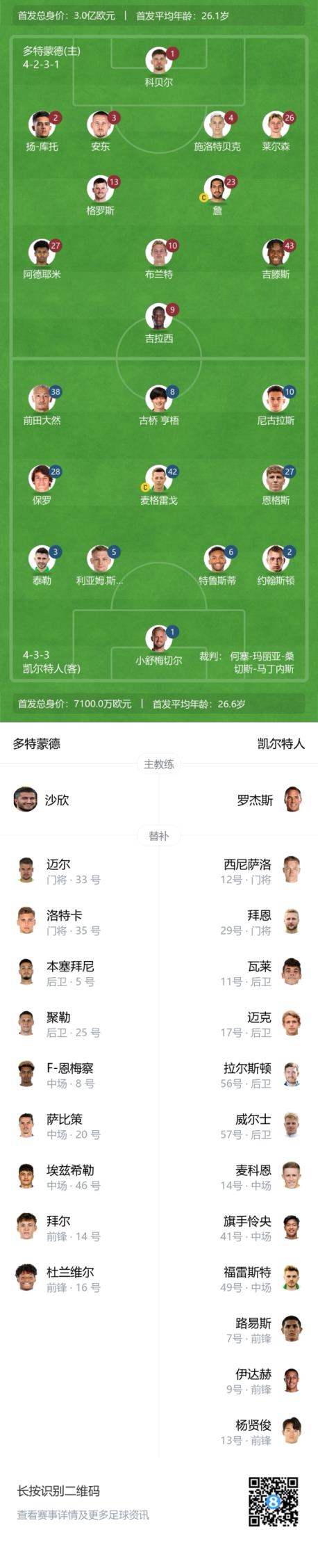 多特蒙德首发:1-科贝尔、2-扬库托、3-安东、4-施洛特贝克、26-莱尔森、10-布兰特、13-格罗斯、23-埃姆雷-詹、9-吉拉西、27-阿德耶米、43-吉滕斯