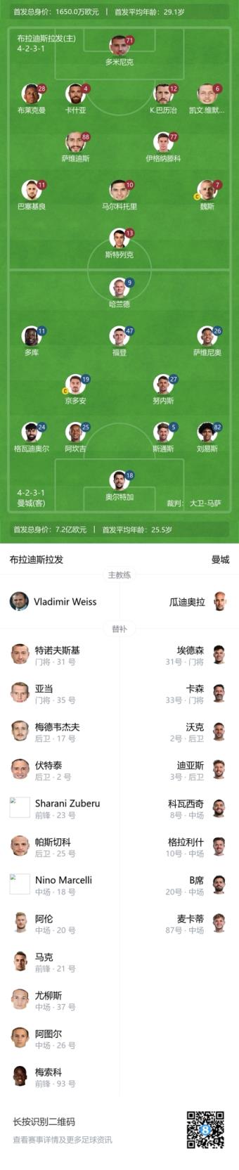 10月2日讯 欧冠联赛阶段第2轮,布拉迪斯拉发主场vs曼城,赛前首发名单公布。