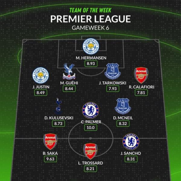 中场:库卢塞夫斯基(热刺,8.73分)、帕尔默(切尔西,10分)、麦克尼尔(埃弗顿,8.32分)