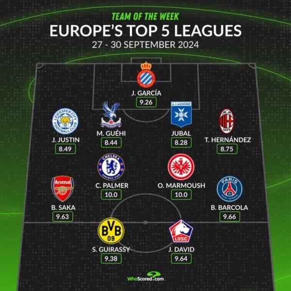 10月2日讯 whoscored统计了本周五大联赛最佳阵,帕尔默和玛穆什均获评满分。