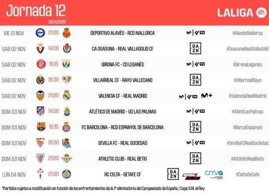 10月2日讯 西甲官方公布第12轮比赛时间,皇马vs瓦伦西亚11月3日4点进行,巴塞罗那德比11月3日23:15开球。