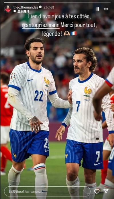 在个人社媒,特奥晒出与格列兹曼在法国队的合影,同时配文:“很自豪在你身边踢球,谢谢你所做的一切,传奇。”