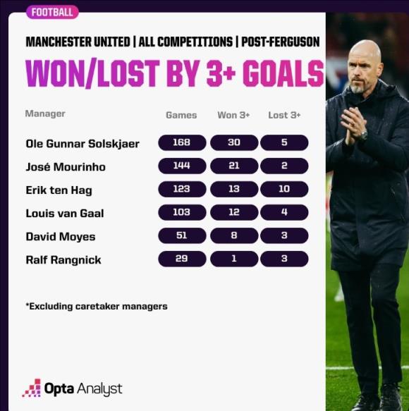 在弗格森之后的所有曼联教练中,10场的数据是其他任何一位教练的至少两倍,索尔斯克亚曾5次至少输3球,不过他30次至少赢3球。