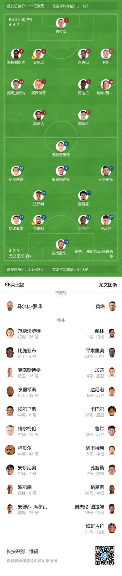 莱比锡首发:1-古拉西、3-海特勒伊达、4-奥尔班、22-劳姆、23-卢科巴、8-海达拉、10-哈维-西蒙斯、13-赛沃尔德、14-鲍姆加特纳、11-奥蓬达、30-塞斯科