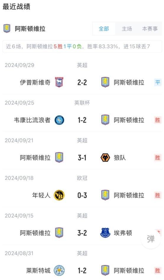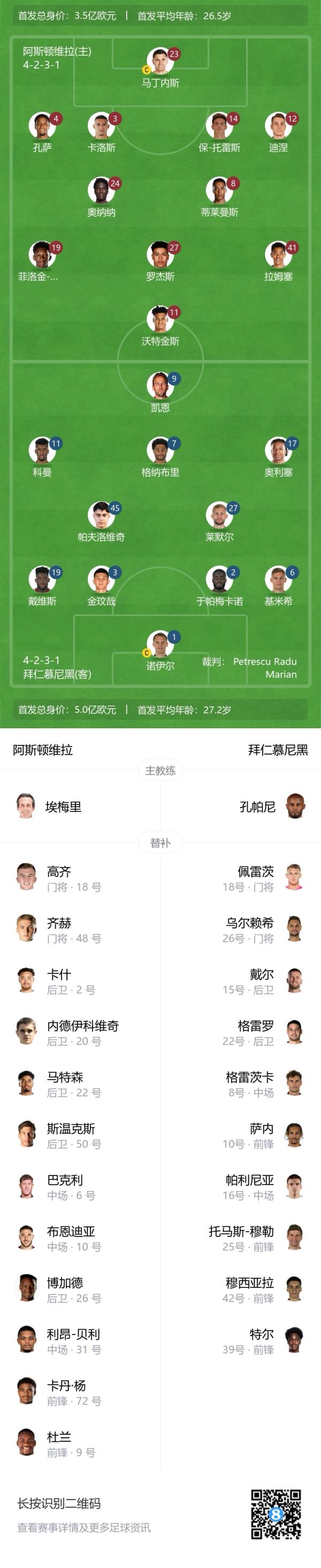 维拉首发:23-马丁内斯、3-迭戈-卡洛斯、4-孔萨、14-保-托雷斯、12-迪涅、8-蒂莱曼斯、41-雅各布-拉姆塞、24-阿马杜-奥纳纳、27-摩根-罗杰斯、19-菲洛金、11-沃特金斯