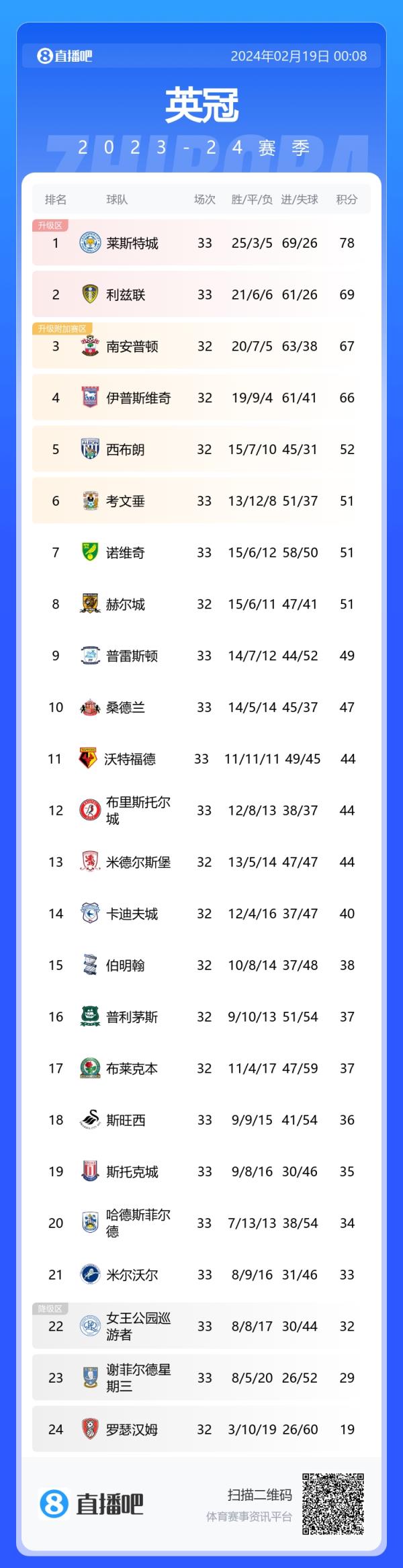 反观英冠,上赛季降级3支队列积分榜前三,莱斯特城更是遥遥领先,升级在望。