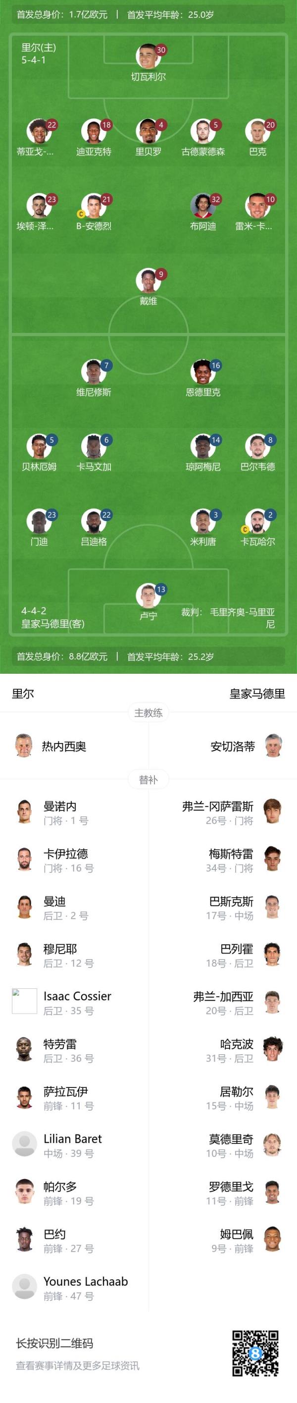 里尔首发:30-舍瓦利耶、22-蒂亚戈-桑托斯、18-迪亚凯特、4-亚历山德罗-里贝罗、5-古德蒙森、20-巴克、32-布阿迪、21-邦雅曼-安德烈、10-卡贝拉、23-哲格卢瓦、9-乔纳森-戴维