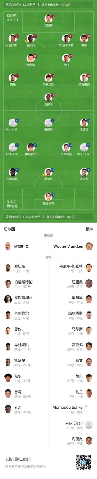 切尔西首发:22-约根森、2-迪萨西、4-阿达拉比奥尤、5-巴迪亚西勒、40-维加、31-卡萨戴伊、22-霍尔、7-内托、14-菲利克斯、10-穆德里克、18-恩昆库