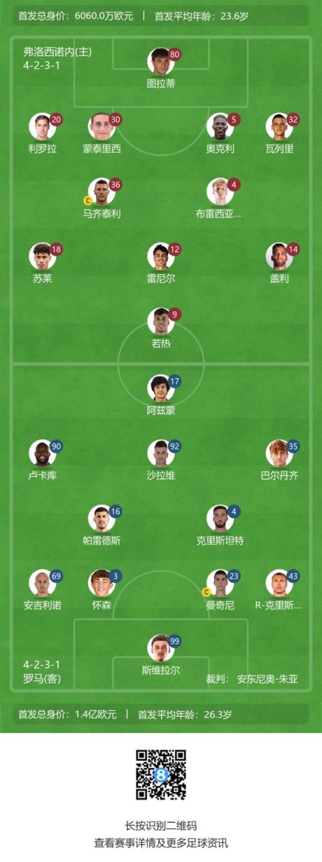 罗马首发:99-斯维拉尔、3-怀森、4-克里斯坦特、16-帕雷德斯、17-阿兹蒙、23-曼奇尼、35-巴尔丹齐、43-拉斯穆斯-克里斯滕森、69-安吉利诺、90-卢卡库、92-沙拉维