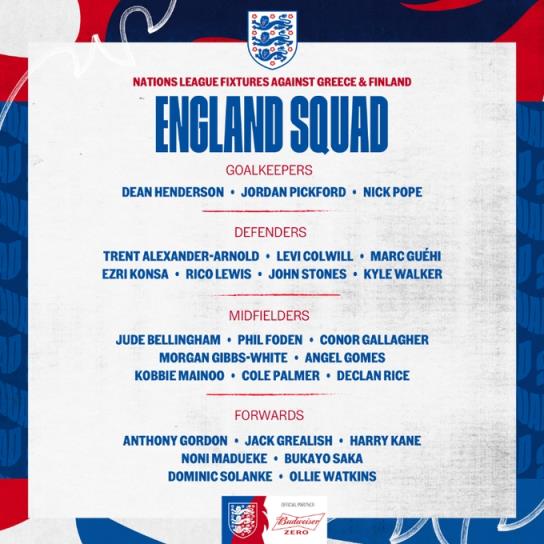英格兰男足代表队公布本期国际比赛日球员大名单,凯恩领衔,索兰克时隔7年重返英格兰队,帕尔默、格拉利什等悉数入选,马奎尔、麦迪逊、桑乔等落选。