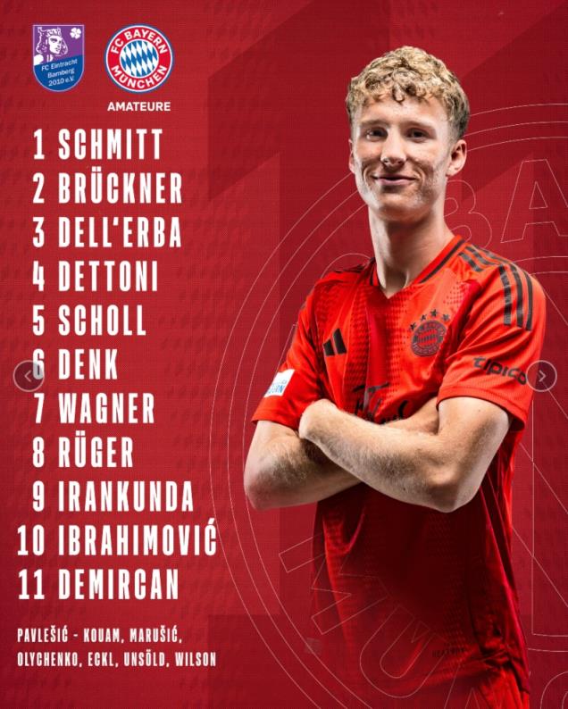 10月4日讯 在今天凌晨1:00即将打响的比赛中,拜仁青年队将客战班贝格。赛前,拜仁公布了比赛的首发名单。其中,季前赛期间受伤的18岁小将阿尔扬-伊布拉希莫维奇首发出战。
