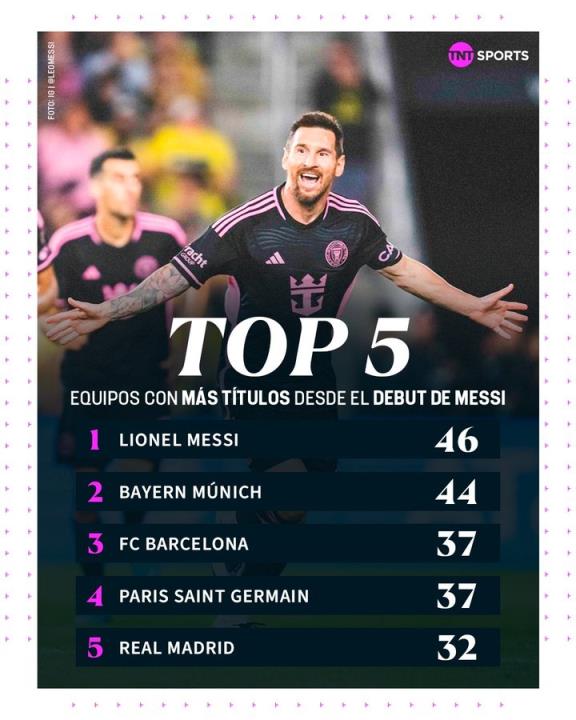 据TNT统计,自梅西2004年首秀以来,他的冠军数比任何俱乐部都多。
