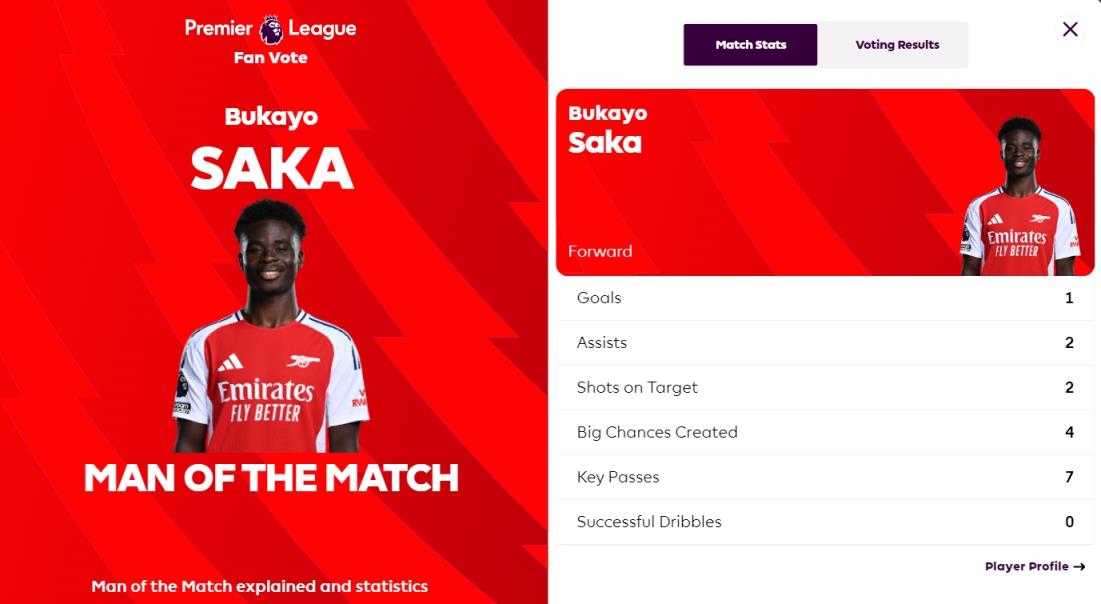 萨卡获得了球迷们77.5%的投票,以绝对优势当选全场最佳。打进1球的哈弗茨排在第二,得票率14.4%,加布里埃尔和拉姆斯代尔分列第三第四。
