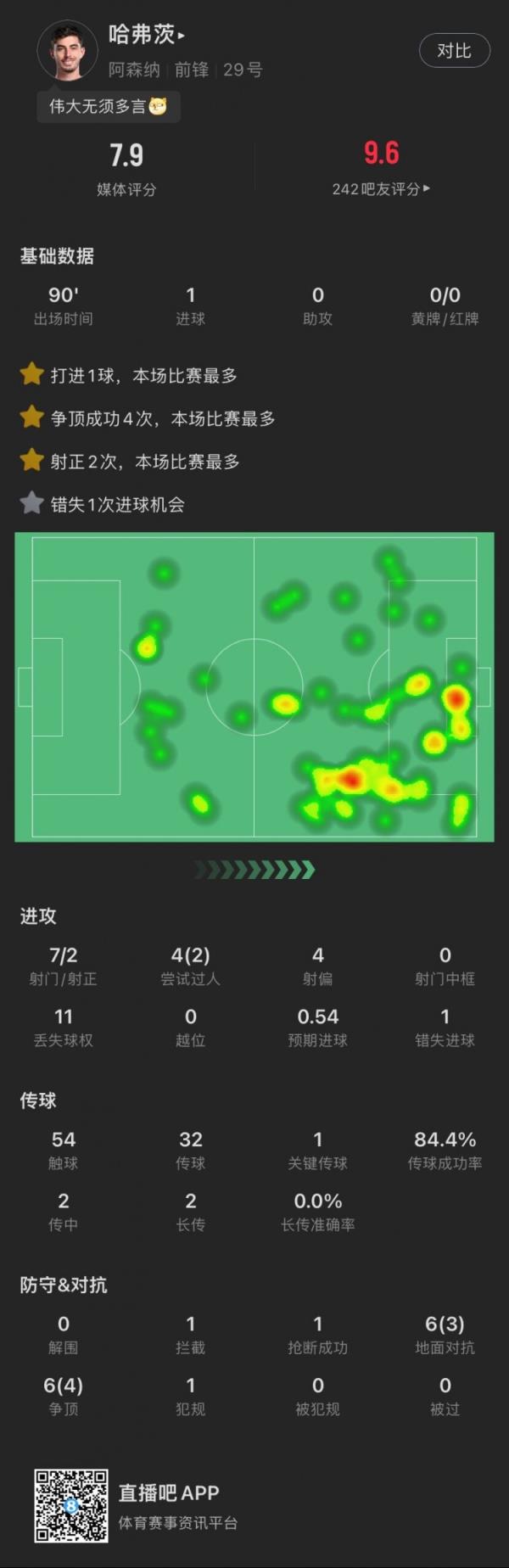 10月5日讯 在刚刚结束的英超第7轮比赛中,阿森纳主场3-1击败南安普顿。本场比赛,哈弗茨发挥出色,在落后时光速帮助枪手扳平比分。他获得了SofaScore7.9分评分,全场仅次于萨卡。