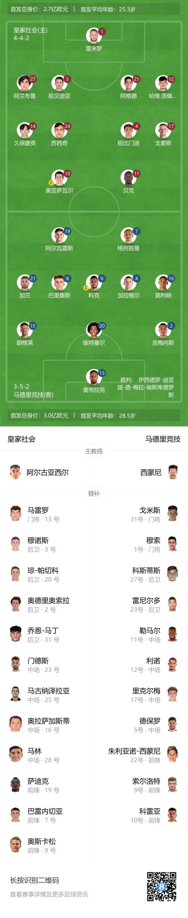 皇家社会首发:1-雷米罗、27-阿兰布鲁、5-祖贝迪亚、21-阿格尔德、12-哈维-洛佩斯、4-祖比门迪、24-苏西奇、17-塞尔吉奥-戈麦斯、14-久保建英、10-奥亚萨瓦尔、11-贝克