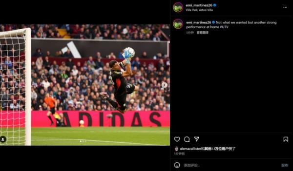 10月7日讯 英超第7轮焦点战,阿斯顿维拉主场0-0战平曼联。本场比赛,马丁内斯发挥出色,赛后他更新了社交媒体。