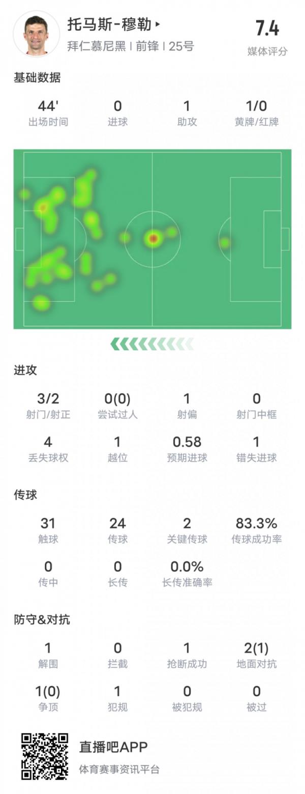 10月7日讯 本赛季德甲联赛第6轮,拜仁半场暂2-2战平法兰克福。穆勒首发出战,送出1次助攻,贡献2次关键传球,但也错失1次进球机会,评分7.4。