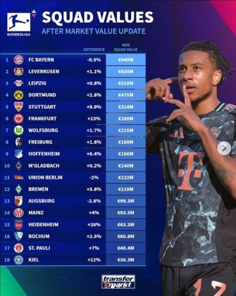 10月10日讯 德国转会市场网更新德甲身价,球队方面,拜仁9.4亿欧居首,勒沃库森第二、莱比锡第三、多特第四。