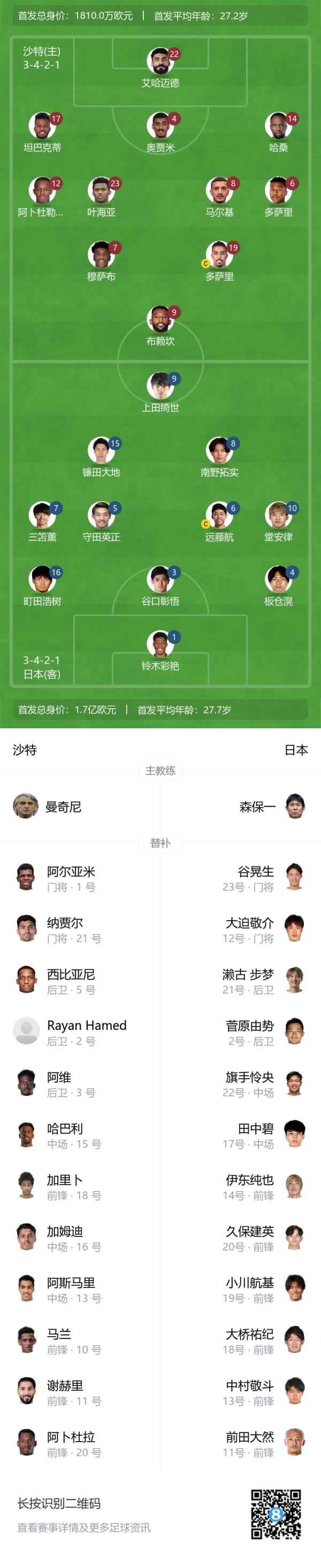 沙特替补:1-阿尔亚米、21-纳贾尔、5-西比亚尼、2-赖扬-哈默德、3-鲁萨里、15-哈巴利、18-加里卜、16-加姆迪、13-阿斯马里、10-马兰、11-谢赫里、20-拉蒂夫