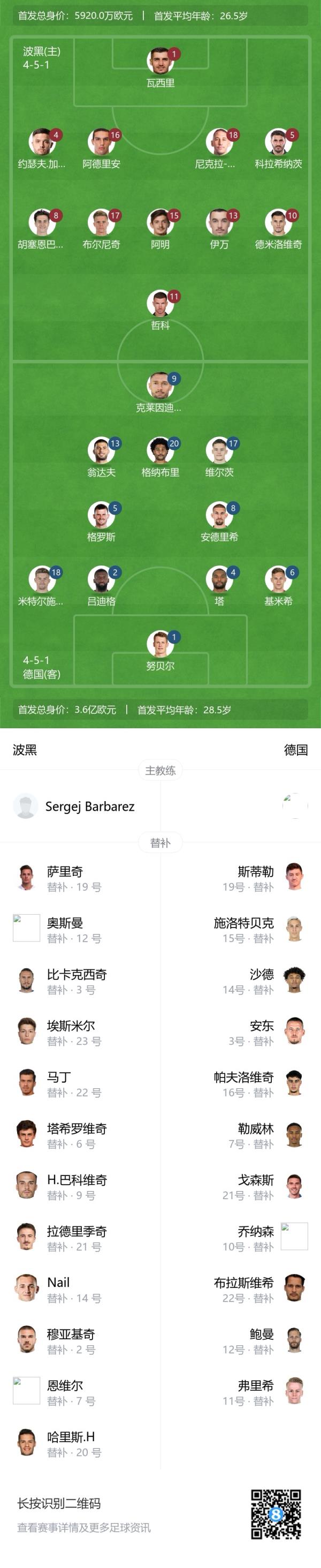 10月12日讯 欧国联A级3组第三轮,波黑主场迎战德国比赛即将打响,赛前首发出炉。