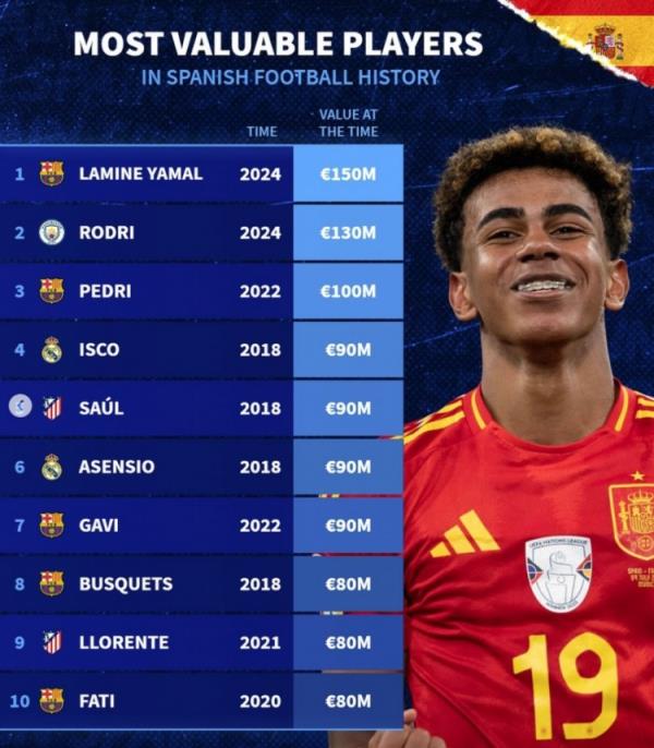 10月12日讯 《转会市场》更新西甲球员身价情况,他们也列出了西班牙籍球员历史身价最贵榜,亚马尔1.5亿欧居首。