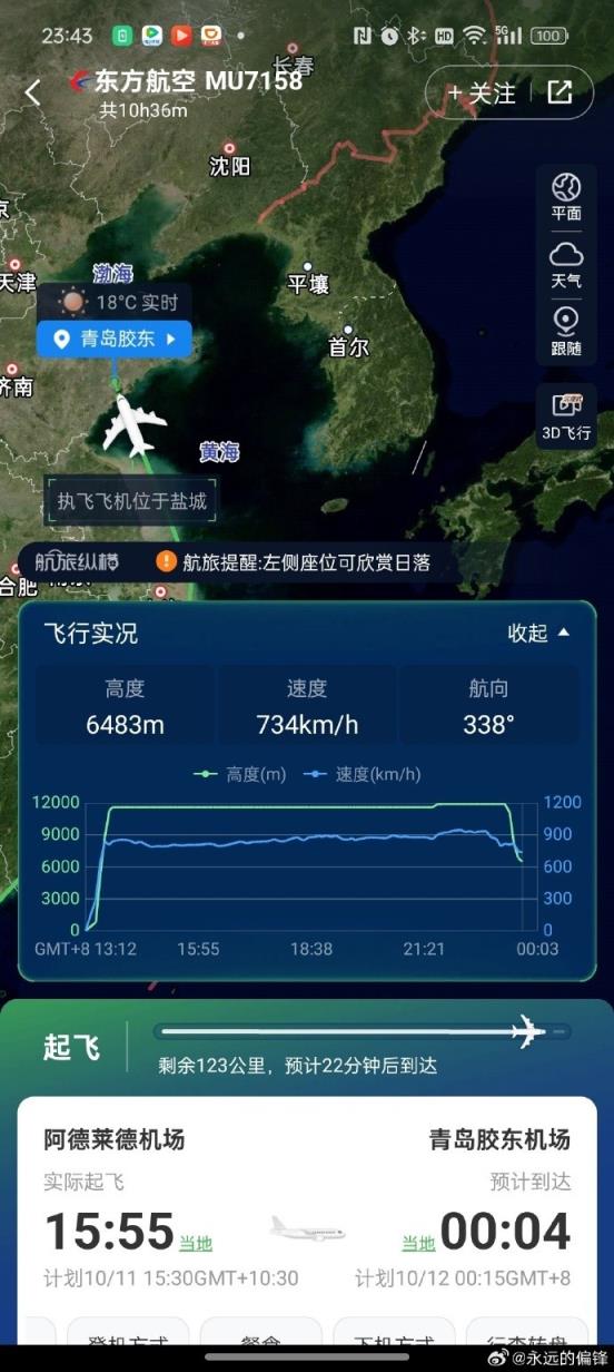 10月12日讯 记者陈永晒出航班图,国足包机即将抵达青岛,备战15日主场对印尼的比赛。