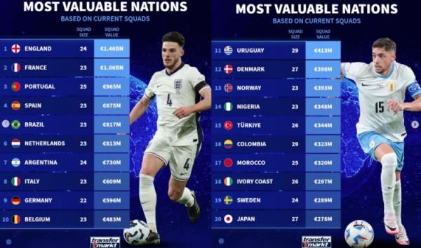 10月13日讯 《转会市场》统计了本期国家队比赛周的各队阵容身价情况,英格兰以14.3亿欧元独自领跑。